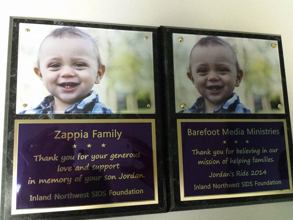 Today, Barefoot Media Ministries and the Zappia family were recognized for their support of the Inland Northwest SIDS Foundation a beneficiary of Jordan’s Ride 2014 & 2015. Founder Liz Montgomery and the Byrne family presented General Manager, Brian Yeager and staff, and mother of Jordan, Candi Zappia, two plaques thanking them for their support of the non-profit foundation and their efforts to spread the word on infant safe sleep practices while offering grief support for families who have lost a child to sudden infant death.